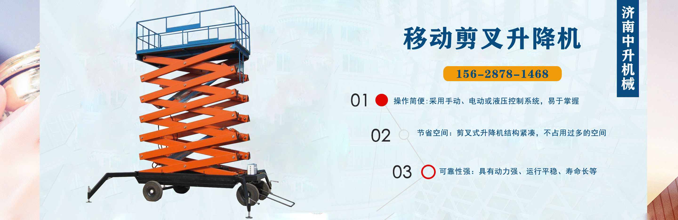 濟(jì)南中升機(jī)械制造有限公司主營移動(dòng)升降機(jī),小型移動(dòng)升降機(jī),移動(dòng)式升降機(jī),移動(dòng)剪叉升降機(jī),移動(dòng)剪叉式升降機(jī)等產(chǎn)品,信譽(yù)良好,歡迎前來咨詢訂購!  在銷售上,尊重每一個(gè)客戶,做到保質(zhì)、保量及時(shí)供貨;在售后服務(wù)上,以較短的時(shí)間,用較快的速度解決,終身追蹤服務(wù)。  公司始終以“品質(zhì)為本,服務(wù)至上”為公司宗旨。致力于提供高品質(zhì)的產(chǎn)品,完善的服務(wù),快捷的供貨,無論您身處何方,都能感受到我們的優(yōu)良服務(wù)。客戶至上,誠信為本。  歡迎各界朋友來電,來函垂詢,選購!...